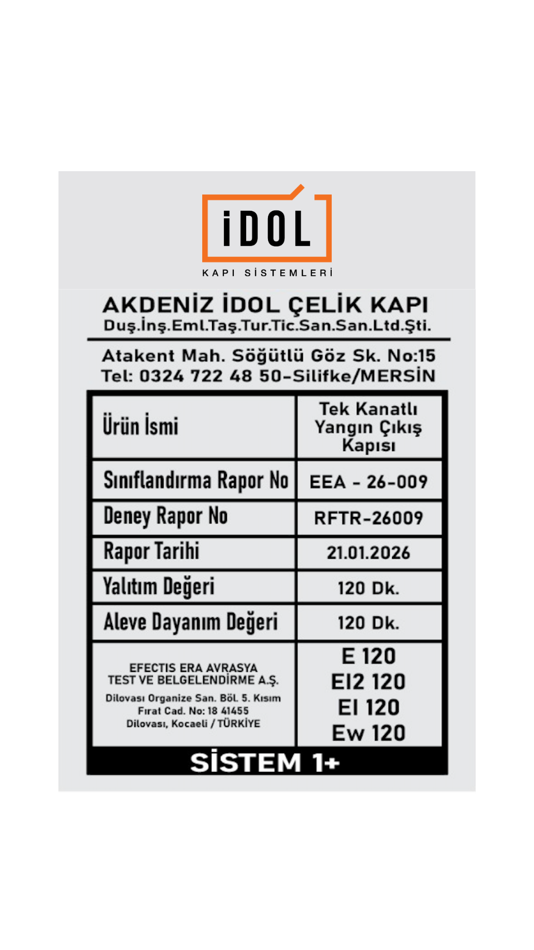 Yangın Kapıları Anasayfa » Yangın Kapıları Modeller İdol Kapı Sistemleri’nin Yangın Kapıları, güvenlik standartlarına uygun olarak tasarlanmıştır. Acil durumlarda hızlı ve güvenli çıkış sağlayarak, yaşam alanlarınızda ekstra güven sunar. Yangın Dayanım Sertifikalı Kapı Belgesi Y-01 Acil Çıkış Kapısı S-01 Şaft Kapağı Y-03 Kilitli Kollu Depo Kapısı Y-04 Elektrik Odası Kapısı C-01 Çift Kanatlı Yangın Kapısı